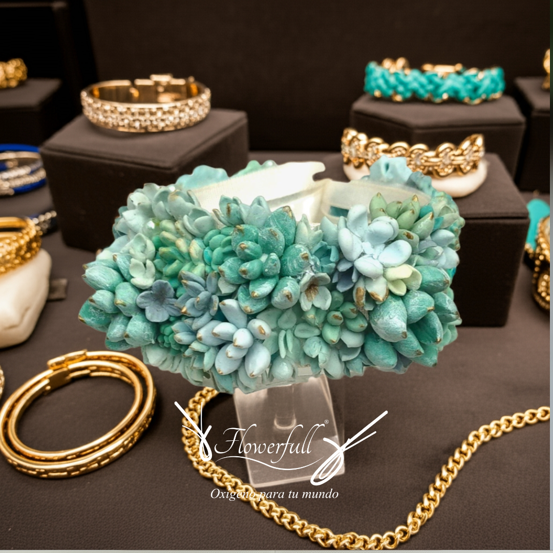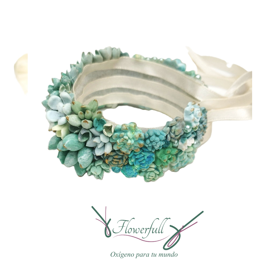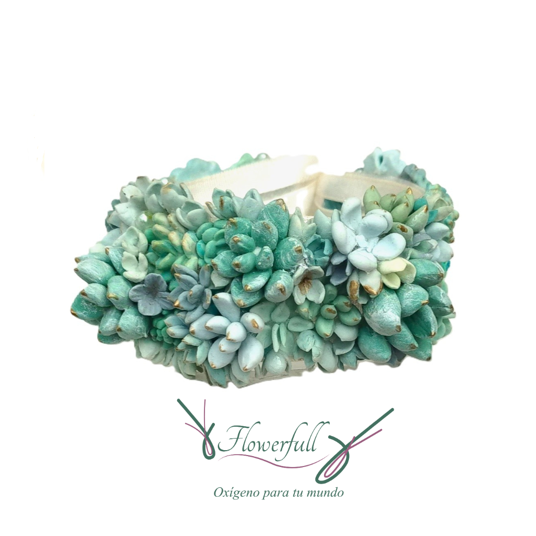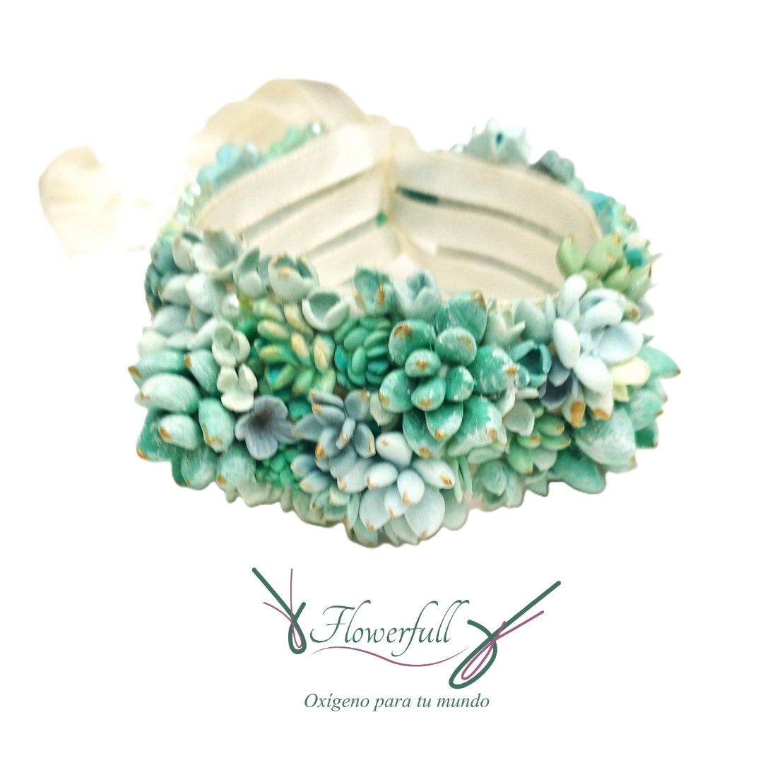 Brazalete de flores y suculentas en colores verde pastel y dorado, en 3D elaborado de Flowerfull clay, con suave listón.