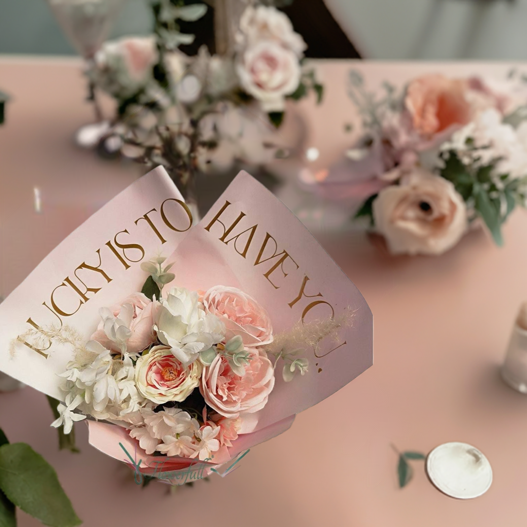 Ramo de flores "Lucky is to have you" en colores palo rosa, con peonia y 3 especies florales adicionales