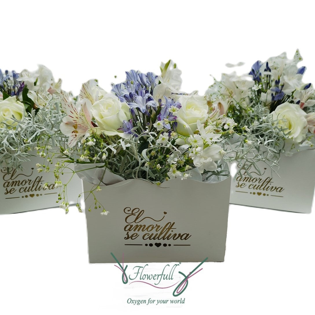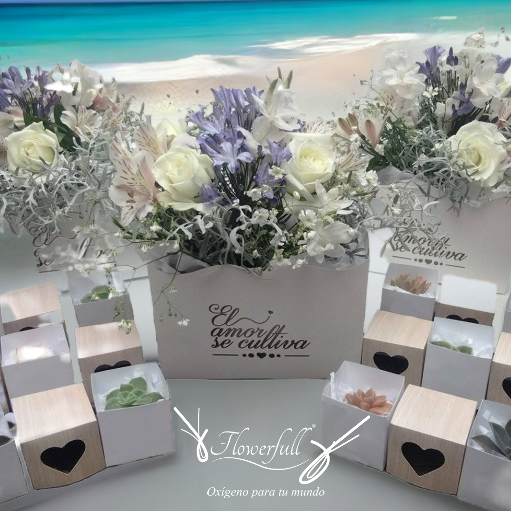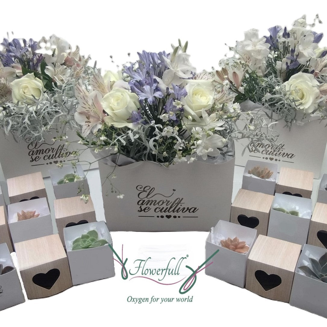 1 Set de centro de mesa con flores de temporada y 10 recuerdos de suculenta en cajita de corazón.
