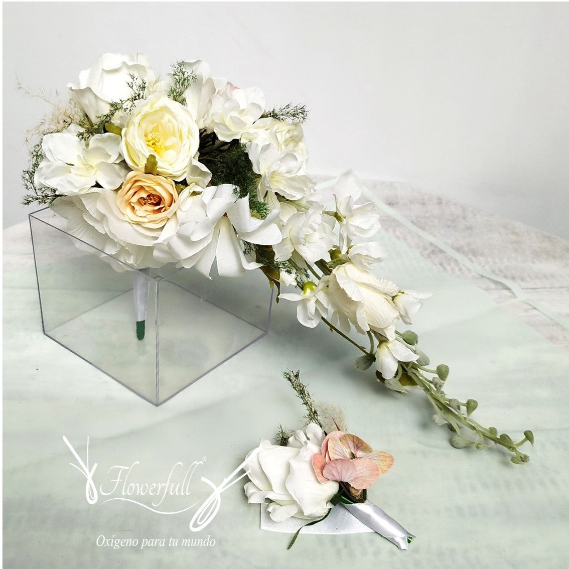 Bouquet y botonier, tipo cascada en paleta de color blanco y peach, con rosa blanca, peonia, orquídea, jazmín, hortensia, 2 especies florales adicionales y follaje preservado,