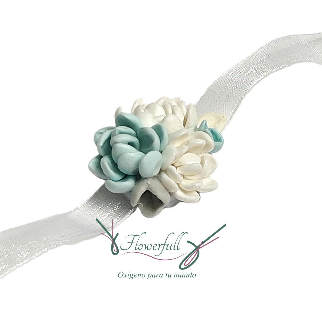 Pulsera de flores y suculentas en colores v celeste pastel y blanco, en 3D elaborado de Flowerfull clay, con suave listón.