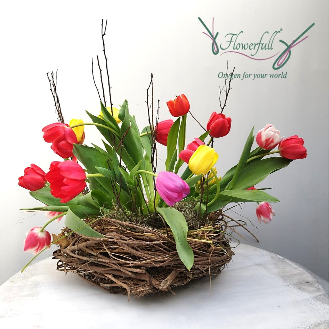 Nido con 18 tulipanes multicolor y ramitas. Disponible en Tulipán natural en enero y febrero. Disponible en Tulipán artificial de marzo a diciembre.