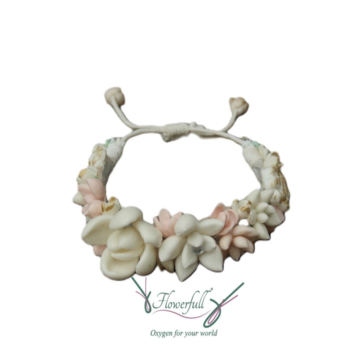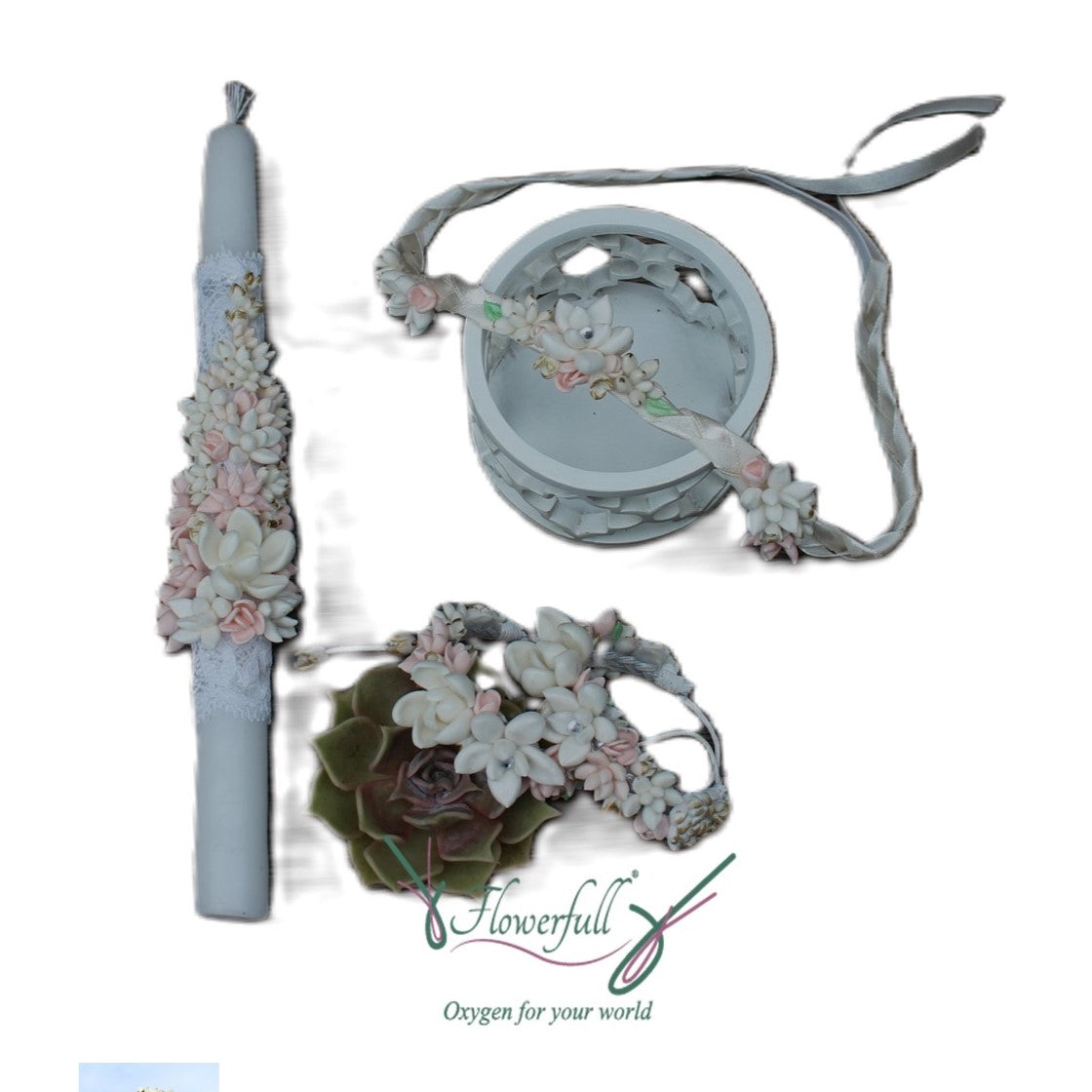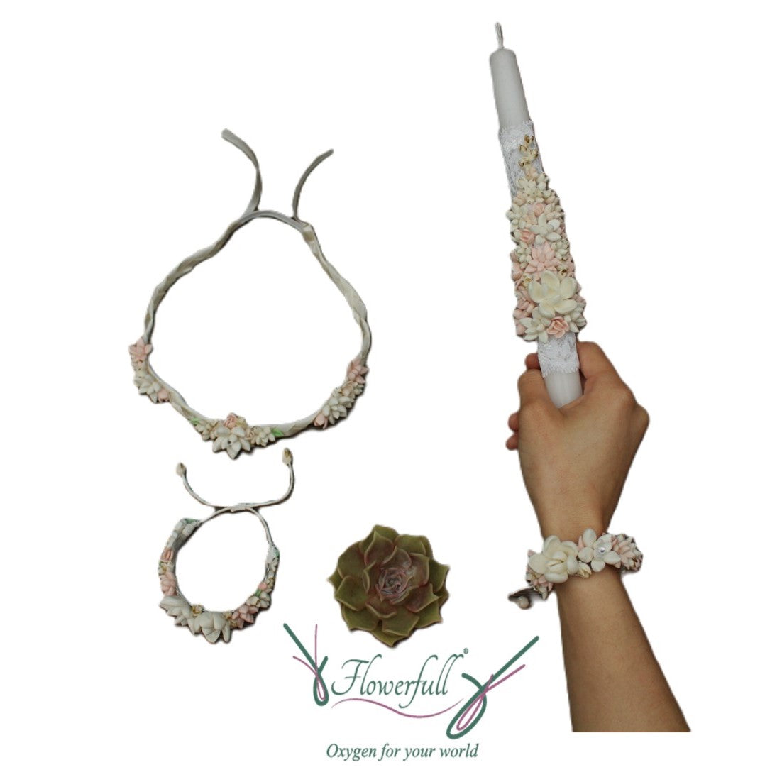 Guirnalda floral, vela decorada, pulsera niña y madrina, suculenta de recuerdo. en colores blanco, nude y rosa pálido, con detalles verdes  con diseño floral en 3D  hecho a mano con Flowerfullclay,  flor artificial.